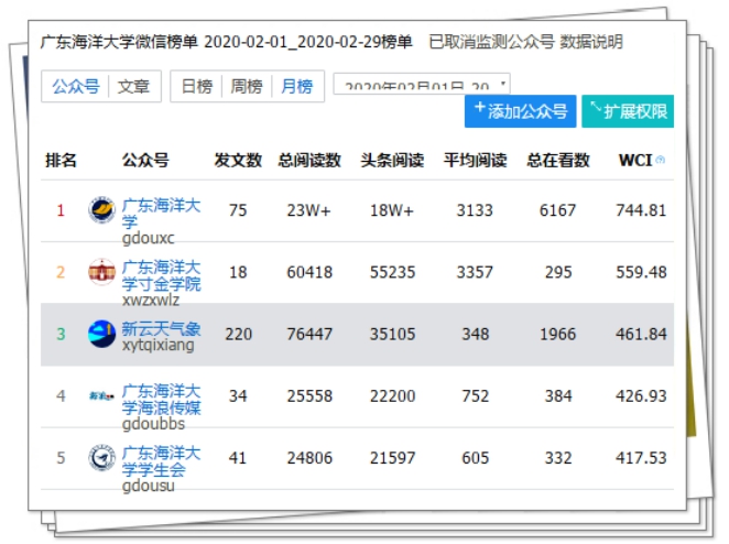 同时,工作室继续做好“新云天气象”公众号的运营,建立师生工作微信群,通过在线采编,集思广益,推送了《坚守!中南地区疫情防控通用航空气象服务平台上线!》《广东省气象大喇叭打通乡村防疫宣传“最后一公里”》等介绍气象人抗击疫情事迹的文章。公众号2020年2月共发布推送文章220篇,实现总阅读数超7.6万人次,微信影响力指数(WCI)达461分,成功进入AC米兰微信榜单前三名,建成全国气象业内有较大影响力的自媒体平台,促进了学院创新创业氛围的形成。