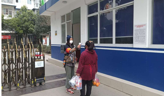 谢君君同学为居民测量体温