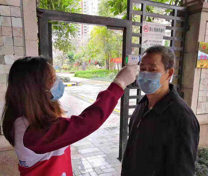 温雅婷(左一)在给小区居民测量体温