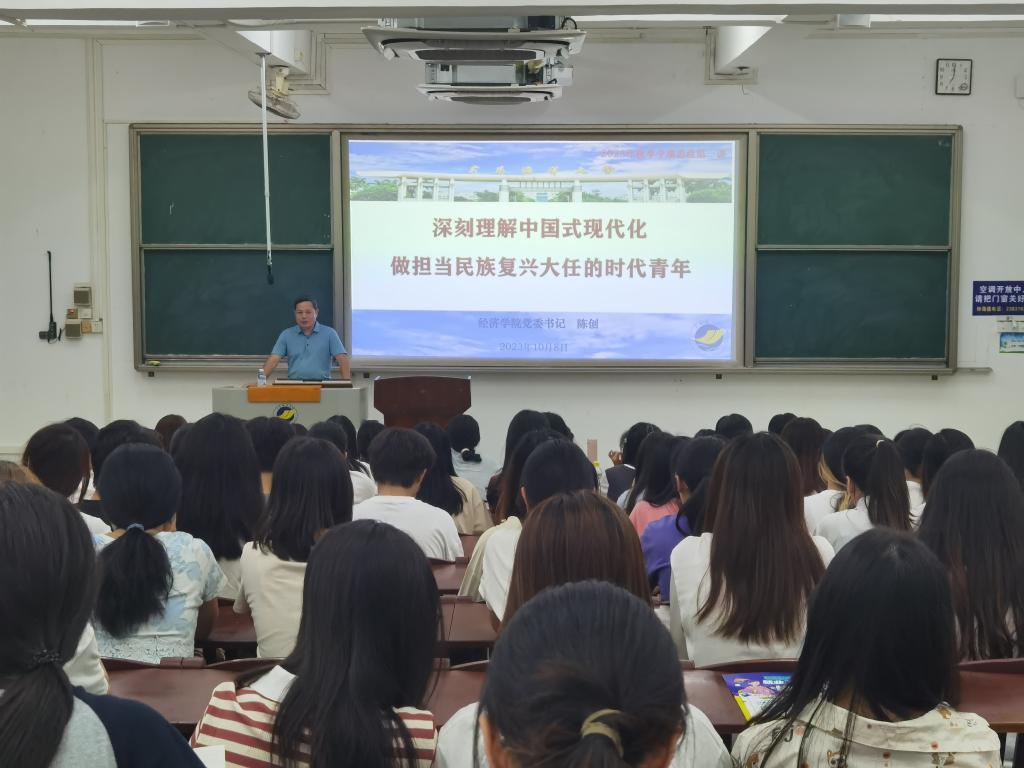 10月8日晚,经济学院党委书记陈创在钟海楼05021室以《深刻理解中国式现代化,做担当民族复兴大任的时代青年》为题讲授2023年秋季学期“思政第一课”。学院入党积极分子、入团积极分子和“青马工程”培训班学员共108名学生代表参加学习。