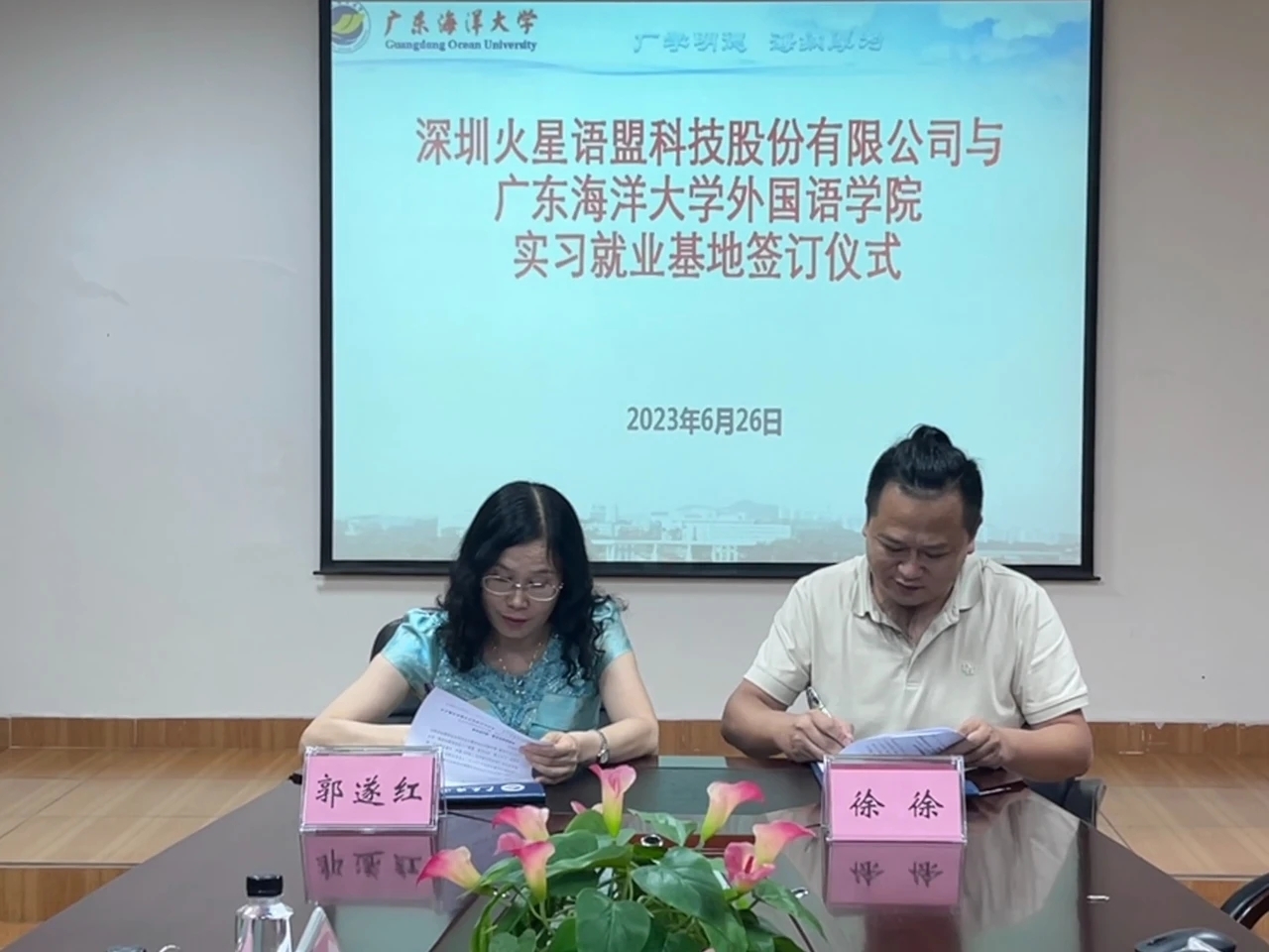 6月26日,在湖光校区兴教楼105室,外国语学院举办深圳火星语盟科技股份有限公司实习基地签约授牌仪式。学院正处级辅导员、学院党委副书记刘艳主持仪式。学院院长郭遂红、副院长何谦卫、副院长安丰科、学院党政办主任黄海文、日语系主任张乐乐、英语系主任毛妙维及火星语盟副总裁徐徐、火星语盟华南区校企负责人陈嘉瑜出席仪式。