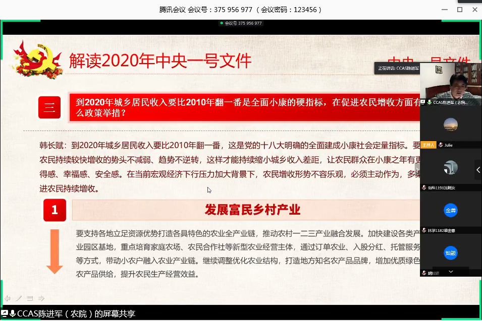 22日下午,陈进军以《解读2020年中央一号文件——关于抓好“三农”领域重点工作确保如期实现全面小康的意见》为题作报告,他从“党的十九大”“全面建成小康社会”“2020年三农工作的总要求”三个层面阐述了2020年中央一号文件的发布背景,从“坚决打赢脱贫攻坚战”“对标全面建成小康社会加快补上农村基础设施和公共服务短板”“保障重要农产品有效供给和促进农民持续增收”“加强农村基层治理”“强化农村补短板保障措施”等五个方面介绍了2020年中央一号的主要内容,并深入浅出地解读了2020年中央一号文件的重要精神。他强调, 在抗击疫情的当下,一方面要坚决打赢疫情防控阻击战,争取尽早取得完胜;另一方面要努力克服疫情对脱贫攻坚的影响,切实把脱贫攻坚工作抓实、抓细、抓落地。