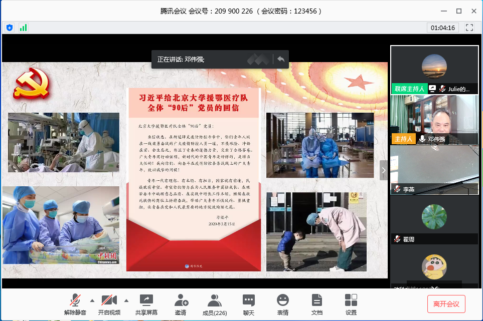 21日下午,邓伟强以《战“疫”下农院人的责任与担当》为主题作报告。报告从党的十九大报告指出的国内形势机遇与挑战中引出,用多组图片、丰富的事例讲述了新型肺炎疫情发生以来,在以习近平总书记和党中央的坚强领导下,全国人民齐心协力抗击疫情取得的重要成效和感人的战“疫”故事,充分彰显了中国共产党领导和中国特色社会主义制度的优越性。接着,他结合学习《习近平给北京大学援鄂医疗队全体“90后”党员的回信》和《习近平给全国涉农高校的书记校长和专家代表的回信》的重要精神,肯定了学院师生在疫情防控工作中所做的重要工作和突出表现,表示学院要围绕国家、学校发展的定位与要求,群策群力谋划好学院的发展新目标,并同时持续推进好学院的疫情防控工作。他强调,一是进一步提高政治站位,增强“四个意识”,坚定“四个自信”,做到“两个维护”,对党忠诚。二是严格执行学校防控工作的最新要求,继续抓紧抓实抓细疫情防控的相关工作,防患于未然。三是希望青年人把个人的理想同国家的前途、民族的命运紧密结合起来,时刻听从祖国的召唤,。四是要立志到祖国最需要、最艰苦的地方去工作,建功立业。