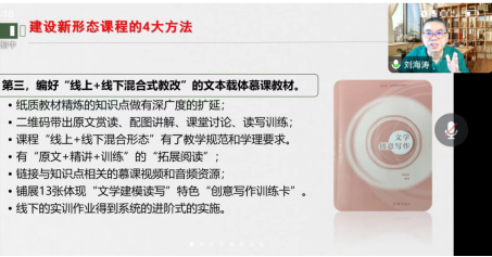 岭南师范学院线上线下混合式国家级一流课程获得者刘海涛教授分享了自己《文学创意写作》国家级一流课程建设与申报的经验体会:一是从写作课程改革建设的基本出发点,指出了写作课教学面临的三大痛点,以及课程改革和教材编写经历的三大转型。二是提出了新时代新技术背景下的教改转型路径、建设新形态课程与教材的四大方法、新时代创意写作教师的修炼路径。三是课程成果以“慕课、音频课、专栏、论文、教材”全媒体出版。随后,刘海涛针对如何调动学生学习积极性、教材编写与一流课程教材选择等内容与学院老师进行了热情的互动交流。
