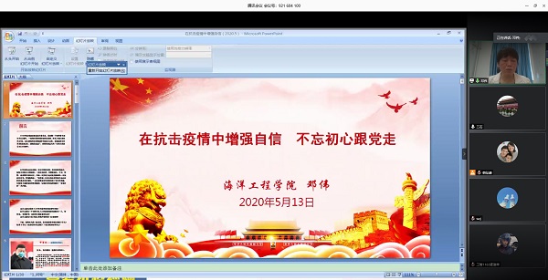 5月13日下午,海洋工程学院党总支书记邓伟通过腾讯会议,以《在抗击疫情中增强自信 不忘初心跟党走》为题,开讲本学期“思政第一课”,学院全体学生党员、发展对象以及入党积极分子共80多人聆听了本场专题思政课。
