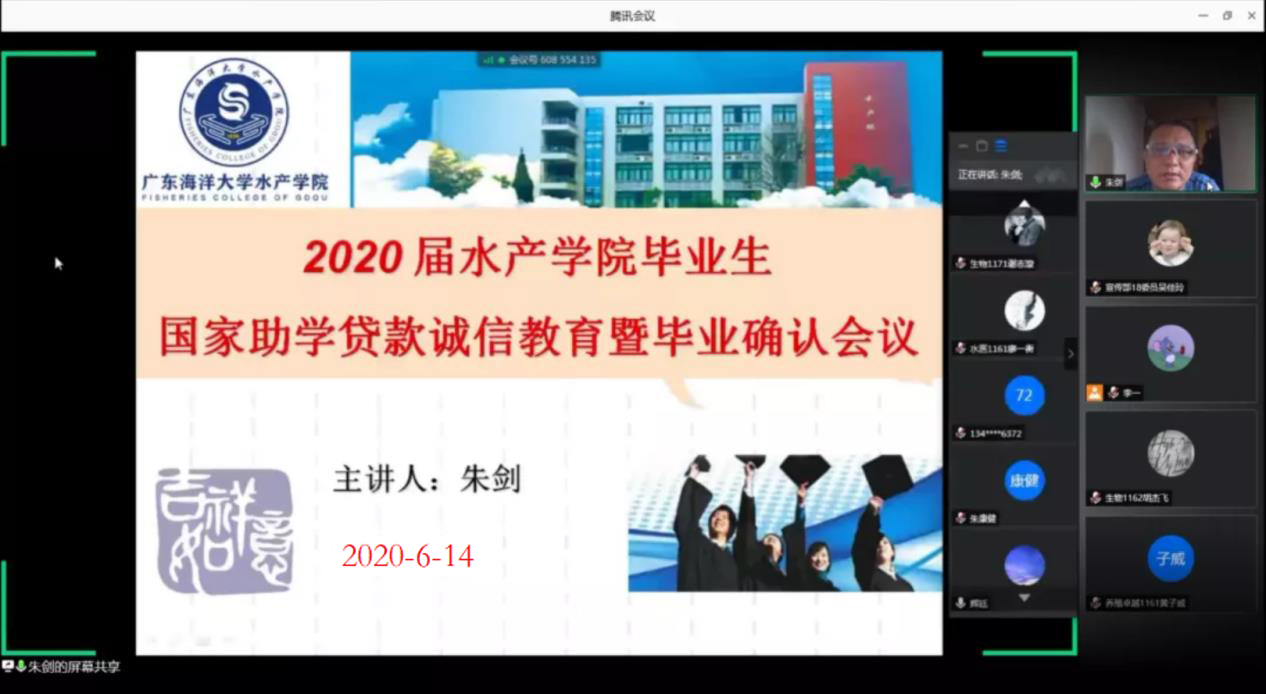 6月14日上午,水产学院通过腾讯会议平台开展2020届毕业生国家助学贷款诚信教育暨毕业确认会议,学院2020届贷款毕业生参加了会议,会议由学院负责助贷工作的辅导员朱剑老师主持。
