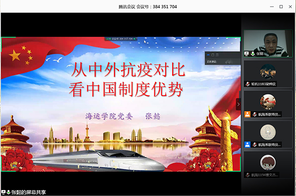 5月20日下午,海运学院党委书记张懿通过腾讯会议平台以《从中外抗疫对比,看中国制度优势》为题讲授 “思政第一课”。学院入党积极分子、党员发展对象以及部分学生党员等100多人参加了会议。