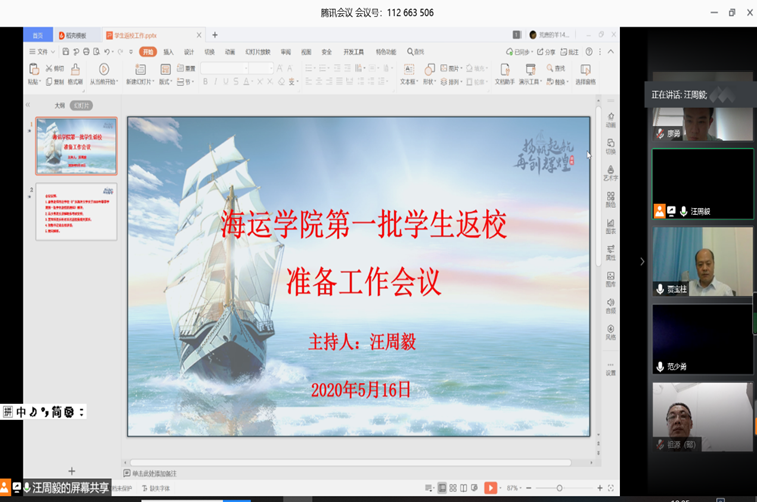 5月16日上午,海运学院返校学生防疫工作领导小组通过腾讯会议平台召开了第一批返校学生工作会议。工作小组全体人员、第一批返校全体学生参加了会议,会议由学院党委副书记汪周毅主持。