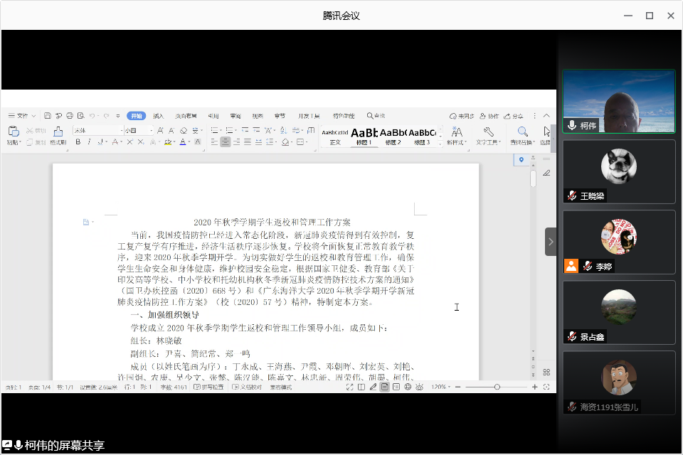 全体参会人员认真学习了学校《2020年秋季学期学生返校和管理工作方案》。柯伟传达了学校关于2020年秋季学期学生返校和管理工作会议的内容精神以及学校领导和职能部门关于做好学生返校相关工作的部署和要求。会上,大家还对一些学生关心的具体问题及事项进行了交流讨论。