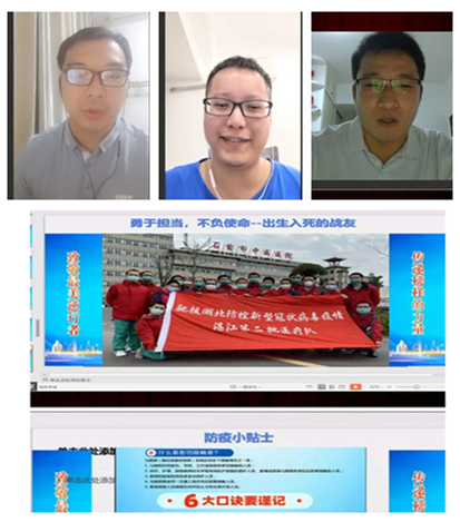 湛江市第二批援鄂医疗队队长孙小聪以《援鄂抗疫 感受中国力量》为题,通过援鄂抗疫期间的相片分享了医疗队人员组成、开展工作情况,分享自己的感悟:“到祖国最需要的地方去”,“发挥业务优势”,“全世界通过‘战疫’更多感受到的是中国力量、中国速度、中国精神”。援鄂医疗队队员陈旭亮则以援鄂前一晚的心情、援鄂期间的火线入党等重要场景分享了自己的心得体会。援鄂医疗队队员周健东以《职责所在 使命召唤》为题,分享了援鄂抗疫期间自己的体会和常态化防疫期间的防疫小常识。