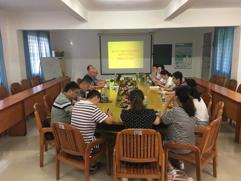 9月16日上午,海洋与气象学院在海博楼210室召开2020年纪律教育学习月活动动员部署会,学院领导、党委委员、纪委委员、支部书记、组织员、全体辅导员、副科级及以上干部参加,会议由学院党委书记陈晓主持。