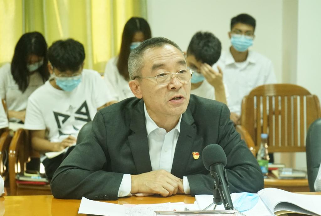 11月19日下午,第九期“思政小客厅”活动在图书馆702室进行。校党委书记曹俊明,党委办主任王明对、党委宣传部常务副部长欧卫军、马克思主义学院党总支书记宋玉忠、党委研究生工作部副部长陈汉能、校团委书记郑一鸣、党委组织部副部长刘金明、党委学生工作部副部长邓朝晖、马克思主义学院孙淑秋博士应邀作客本期“思政小客厅”,与40多名“思政小助理”围绕“新时代,新号角,新面貌——学习习近平重要讲话及十九届五中全会精神”主题展开交流。“思政小助理”小组长赵嘉璐主持活动。
