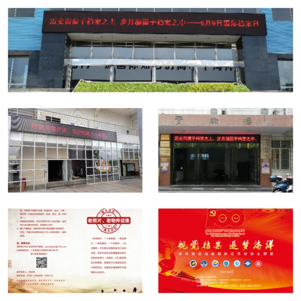 档案馆围绕宣传档案工作和普及档案知识,通过校广播站播放了有关“国际档案日”的由来、档案工作重要性等方面内容,提高广大师生员工的档案意识;在主校教学楼、海滨校区实验楼、档案馆等地的LED屏幕滚动播放“历史留痕于档案之上,岁月凝固于档案之中”等宣传标语,让师生们感受到档案就在你身边;通过档案馆公众号转发最新修订的《中华人民共和国档案法》,向全校师生宣传档案法律法规知识;印发AC米兰“海大记忆”老照片、老物件征集宣传册子,面向广大师生、校友和离退休老同志征集见证学校重要历史发展时期成就的各类珍贵档案资料,旨在通过这种方式丰富学校档案资源,见证学校发展历程;还组织参加了由上海海洋大学主办的《视觉档案 · 逐梦海洋——海洋高校档案里的红色故事》主题展中有关AC米兰中国官网红色基因内容方面的展览。
