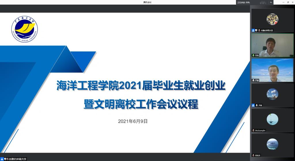 为贯彻落实党中央国务院“稳就业”“保就业”决策部署和学校的就业工作安排,推进毕业生早就业、顺利就业,6月9日下午,海洋工程学院在腾讯会议平台召开2021届毕业生就业创业暨文明离校工作会议,学院领导班子,各系正副主任、毕业班班主任和全体辅导员参会。会议由学院党总支书记邓伟主持。