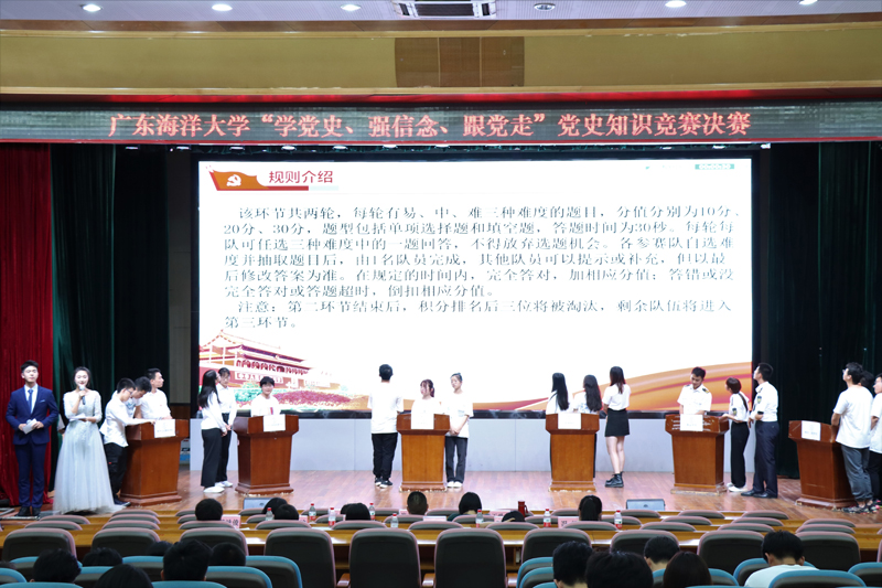 决赛分为“风雨同舟”“百舸争流”“驰思遐想”和“挥斥方遒”四个环节,赛制为积分追逐赛。经过前四个环节的精彩比拼,最终海运学院代表队获得一等奖,海洋工程学院代表队和管理学院代表队获得二等奖,数学与计算机学院代表队、文学与新闻传播学院代表队、经济学院代表队获得三等奖;管理学院代表队获得最佳人气奖。海运学院代表队和海洋工程学院代表队将代表学校参加湛江市“青春忆百年,红色经典传”大学生党史知识竞赛活动。