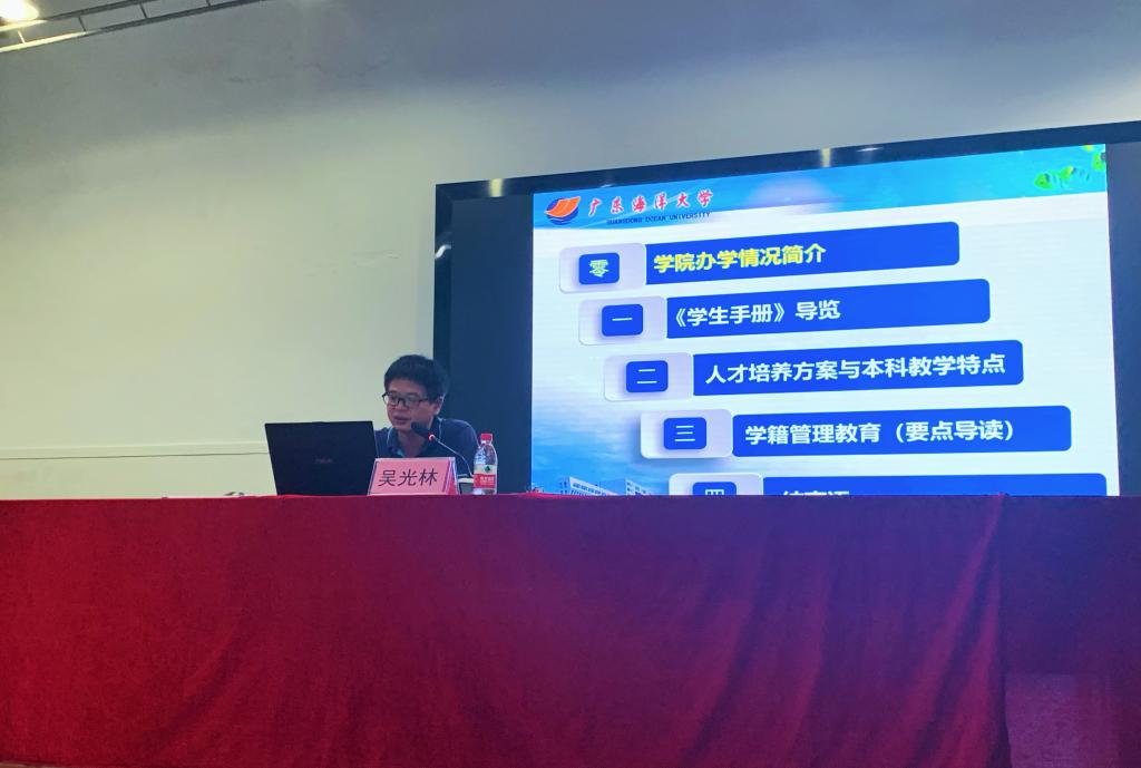 副院长吴光林作新生入学教育,概要导览了《学生手册》,对人才培养方案和本科教学特点、学籍管理等内容进行较为详尽的解读,并为同学们答疑解惑。