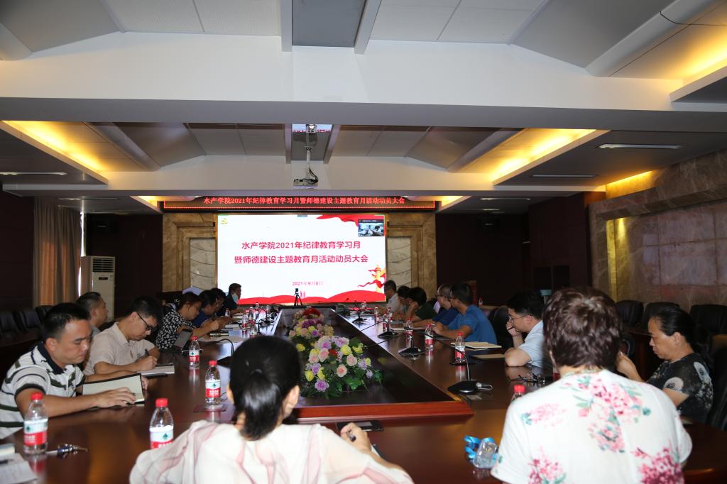 9月8日下午,水产学院以线上线下相结合的方式召开2021年纪律教育学习月暨师德建设主题教育月活动动员大会,学院领导、党委委员、各系(中心、办、基地)正副主任、支部书记、党政办工作人员等20多人集中在水产楼216会议室参加线下会议,其他教职工通过腾讯会议形式参会。会议由学院党委书记梁朝辉主持。