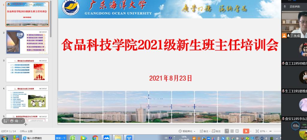 8月23日上午,食品科技学院通过腾讯会议平台召开了2021级新生班主任培训会,学院全体新生辅导员、班主任及班主任助理参加此次会议。会议由学院党委副书记丁永成主持。