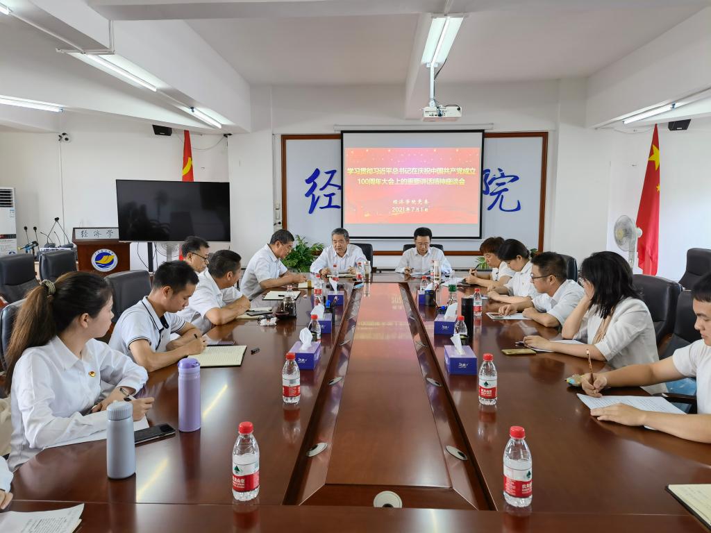 7月1日下午,经济学院党委在主楼718会议室召开学习贯彻习近平总书记在庆祝中国共产党成立100周年大会上的重要讲话精神师生座谈会。学院领导、党委委员、各党支部书记、各系(办)正副主任、“两优一先”表彰对象,以及本科生、研究生新党员代表参加了座谈会。座谈会由学院党委书记肖文辉主持。