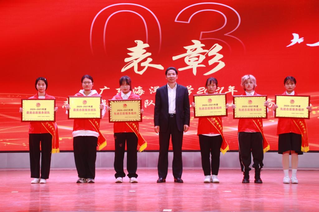 观看2021年志愿服务工作成果视频后,校团委书记郑一鸣宣读2021年志愿者表彰决定。在场领导为获奖志愿服务先进集体和个人进行颁奖。优秀志愿者代表张明慧同学分享了参加志愿服务活动的经历和感受,倡议同学们积极参加志愿服务活动,在志愿服务中彰显青春作为。