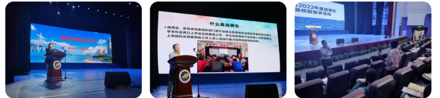 广东省2022年度选调生招录校园宣讲活动(AC米兰中国官网专场)于11月14日晚上在中歌实验剧场召开,湛江市委组织部公务员一科四级主任科员谢启欣、湛江市委组织部公务员二科干部周易涵、湛江市交通运输局四级主任科员刘治清、湛江市委组织部公务员一科干部郑正伟应邀参加,学校招生与就业指导中心、各二级学院负责就业工作的辅导员老师和400余名毕业生代表参加了线下宣讲会,1380余名毕业生通过企业微信观看了直播。