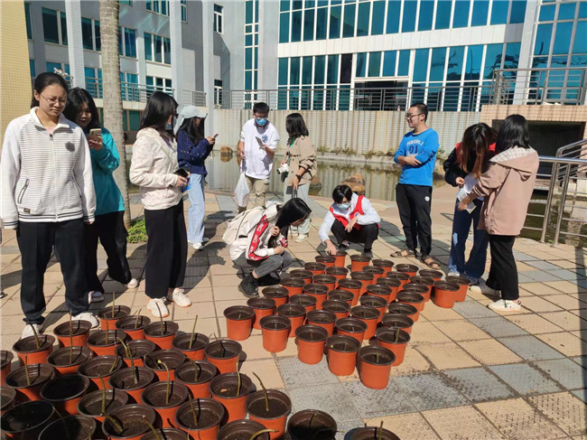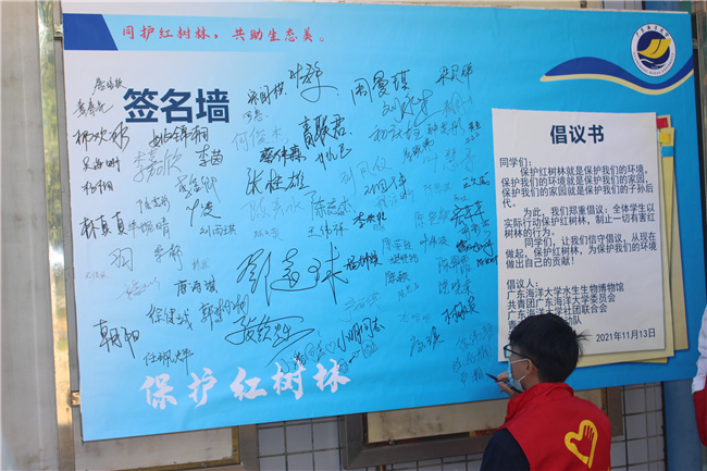 青志联绿色行动队学生代表带领同学们宣读了倡议书,倡议全体学生以实际行动保护红树林,制止一切伤害红树林的行为。同学们一起在签名墙进行签名,并用便利贴书写自己对保护红树林的愿望和祝福。最后,进行了红树辨认及认养活动。此次活动准备了150盆适合种养的秋茄和木榄树苗,同学们热情高涨,纷纷登记认领。认领的同学将撰写养护日记,树苗长到一定大小后将移植到户外红树林区进行种植。
