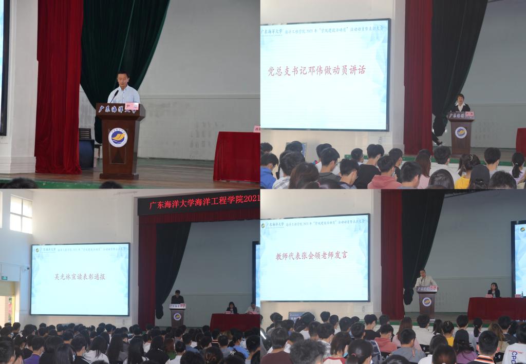 11月10日下午,海洋工程学院在海滨校区小礼堂召开2021年“学风建设活动月”活动动员暨表彰大会,学校教务处处长严谨,学院党政领导、教学系负责人、辅导员以及各班级学生代表共计500余人参加会议。学院党总支副书记尹霞主持会议。