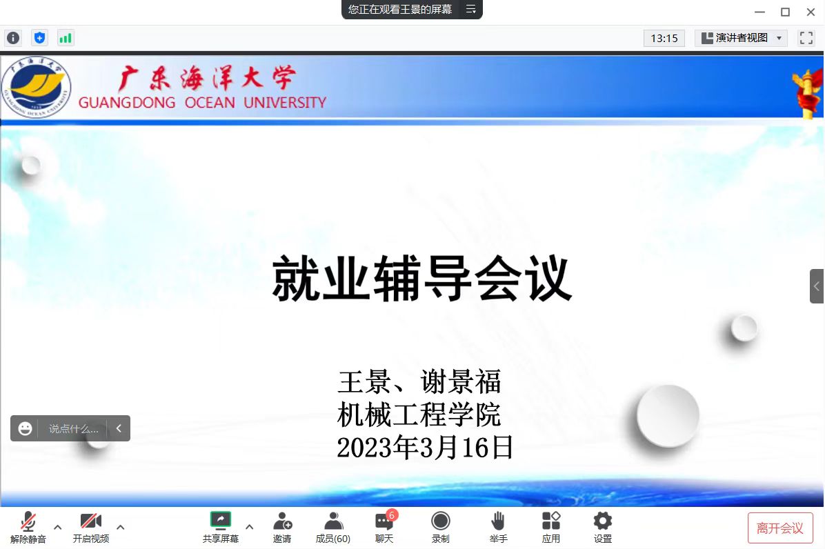 为全面帮扶大学生就业,扎实推进2023届毕业生就业工作,机械工程学院积极开拓就业渠道、建立帮扶台账、大力动员学院老师和校友帮助毕业生就业,3月16日,学院党委副书记钟桂安再次组织会议,分析研判学院毕业生就业形势,动员全体就业工作老师认真落实学校和学生处关于就业工作的安排部署,精准帮助每一位就业困难的学生。2023届毕业班辅导员王景老师、谢景福老师通过线上形式对学院全体毕业生进行了就业培训和教育。