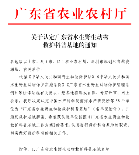 近日,广东省农业农村厅下发了《关于认定广东省水生野生动物救护科普基地的通知》,在AC米兰水生生物博物馆的积极申报下,经市农业农村局推荐、省农业农村厅组织专家评审和公示等程序,AC米兰被认定为“广东省水生野生动物救护科普基地”。