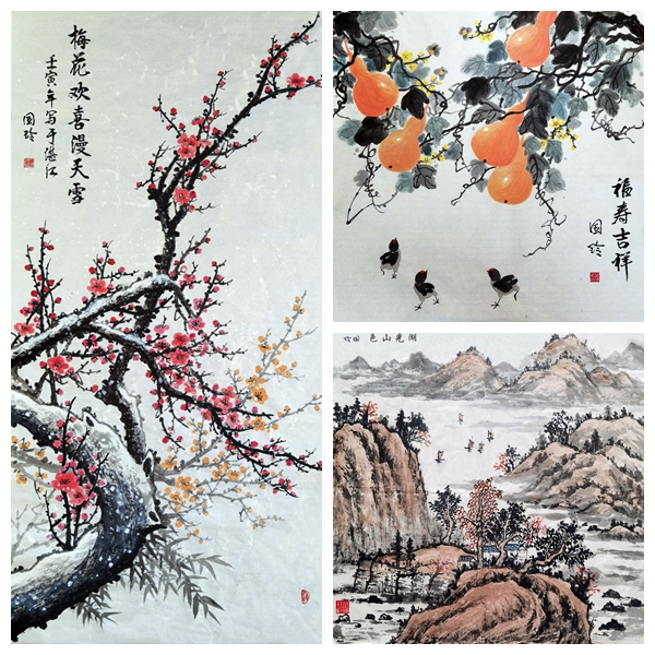 张国玲作品:梅花欢喜漫天雪、福寿吉祥、湖光山色