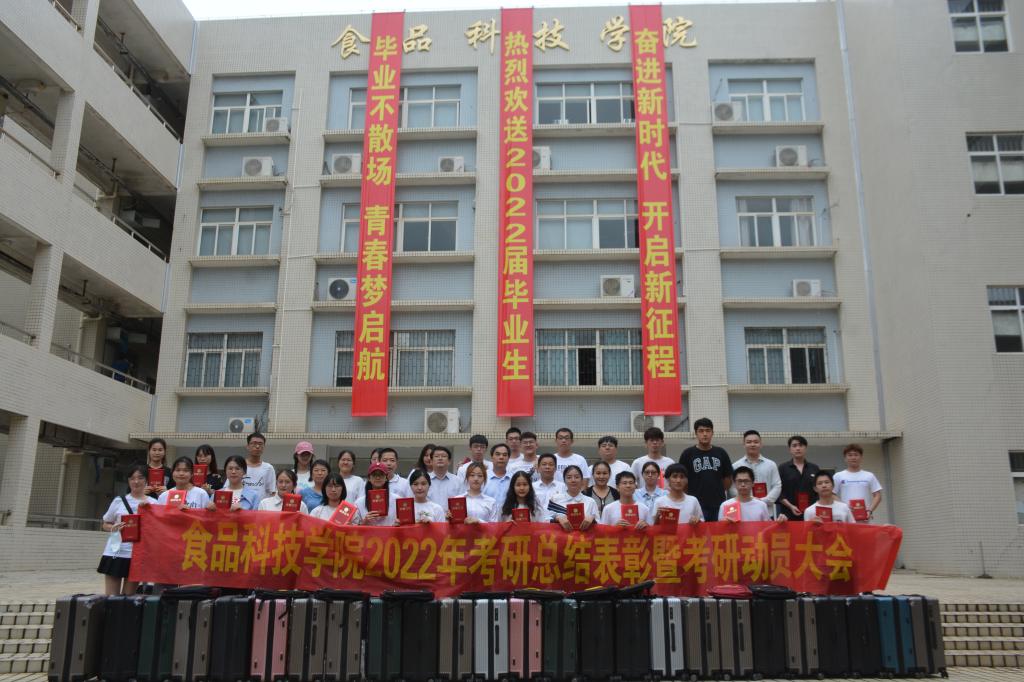 苏永华作总结动员讲话,他向受表彰的考研考博优秀个人表示热烈祝贺,肯定了学院考研考博工作取得成绩。食品科技学院2022届本科毕业生370人,报考硕士研究生(含推免生和国外深造研究生)170人,考研率为45.95%,上线率24.59%,录取65人,录取率为17.57%;2022届全日制硕士毕业生52人,申报博士研究生4人,录取4人,录取率为100%;2022年学院被评为学校2022年考研工作先进单位;这些成绩的取得,是学院全体师生共同努力的结果。苏永华就如何更好地做好2023年考研考博工作提出了三点意见:一是同学们考研考博必须做到个人目标与国家发展结合;二是同学们考研考博必须做到早谋划、早准备,并努力前行;三是学院必须为同学们考研考博提供全方位的支持和服务。
