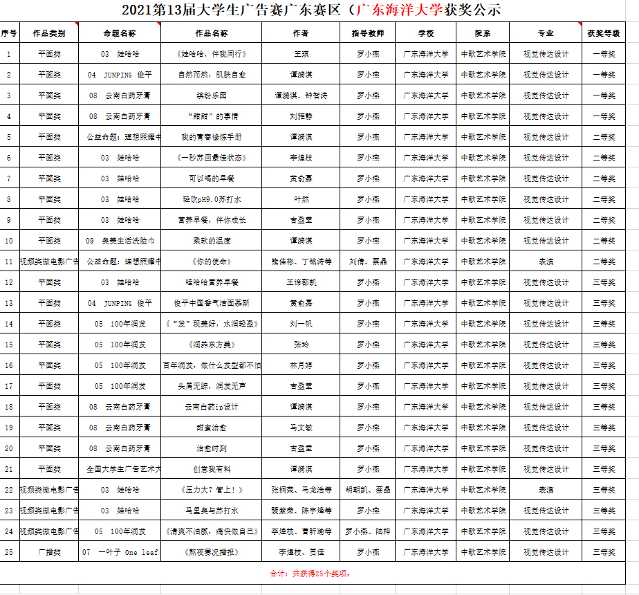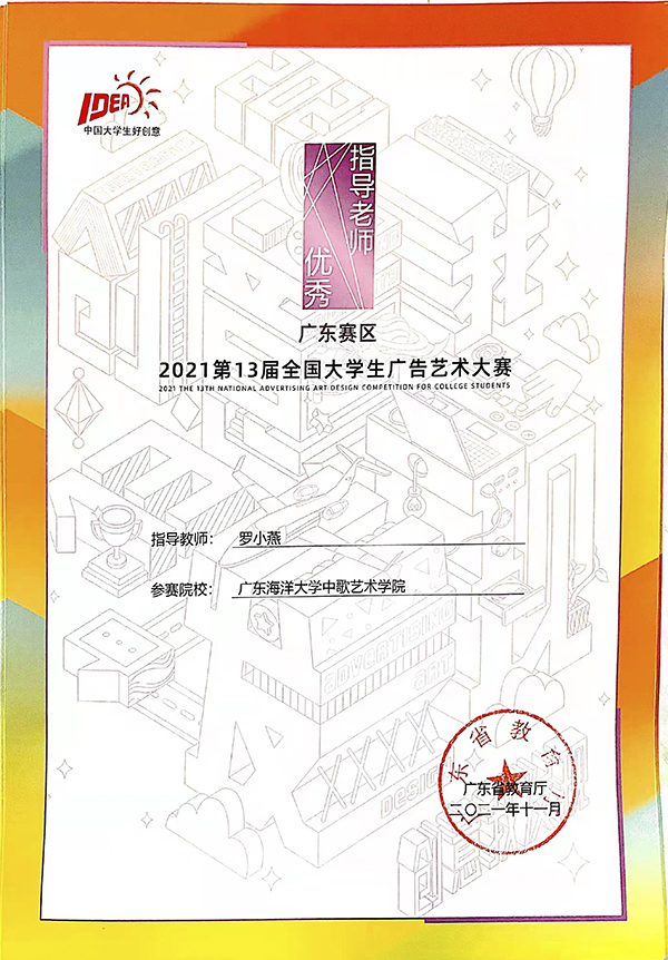 近日,AC米兰中歌艺术学院学子在由教育部高等教育司指导,中国高等教育学会、教育部高等学校新闻传播学类专业教学指导委员会共同主办的第十三届全国大学生广告艺术大赛(广东赛区)上取得优异成绩,斩获大赛25个奖项。其中一等奖4项,二等奖7项,三等奖14项,罗小燕老师获广东省教育厅颁发的“优秀指导教师”奖。