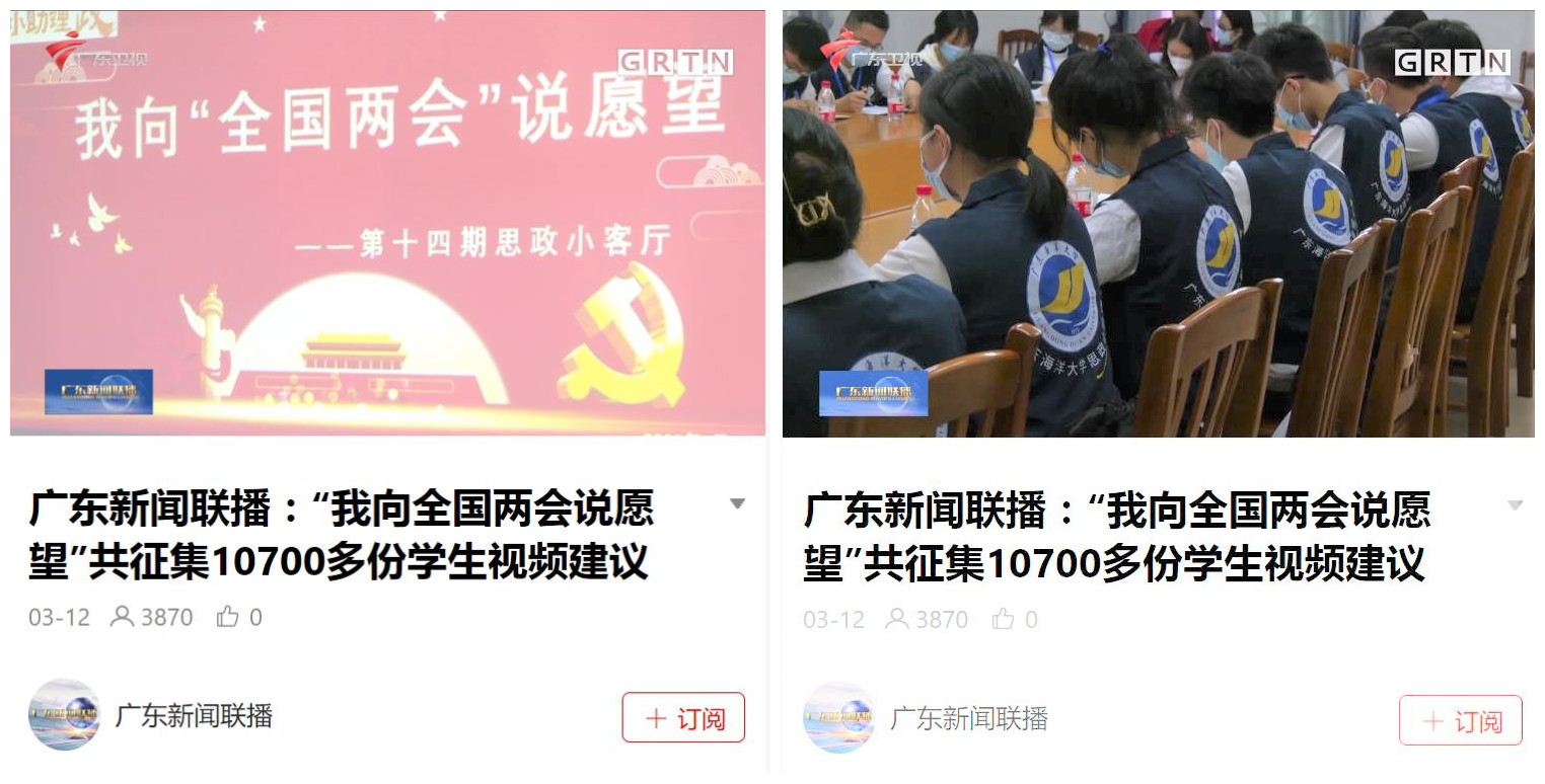 广东新闻联播:“我向全国两会说愿望”共征集10700多份学生视频建议