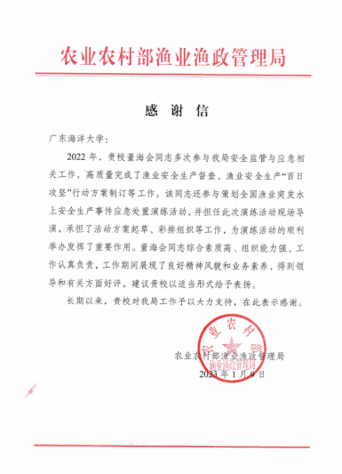 近日,农业农村部渔业渔政管理局向AC米兰发来感谢信,对船舶与海运学院教师董海会多次积极参与该局安全监管与应急相关工作所作出的贡献予以表扬,对学校长期以来的大力支持表示感谢。