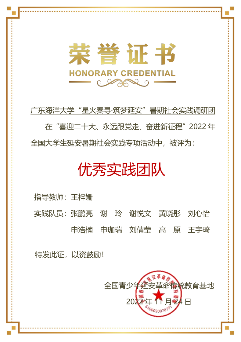 12次现场教学、3次专题理论学习,8场情境微课,1次红色演出观摩,全方位、多维度、深层次的实践学习,使实践队员对延安精神有了更深的认识。实践团队完成了《互联网视域下延安精神在高校思政课堂中的传播研究与应用》调研报告,共发表45篇通讯稿,省市级以上媒体30篇,受到《中国共青团杂志》、中国青年网、人民日报等媒体的关注,部分视频点击量超20w+,团队实践成果丰硕,团队也获评为2022年广东省大中专学生志愿者暑期文化科技卫生“三下乡”社会实践“优秀团队”。