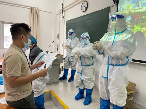 本次培训,全校共有133名教职工志愿参与核酸采样培训,他们之中,既有机关干部,专业老师,也有学院管理人员和后勤人员。培训中,附属医院专业医护人员以PPT宣讲、视频演示以及实操示范等方式,重点围绕采样点设置、物资筹备、测温扫码、穿脱防护服、咽拭子采样技巧和注意事项以及人员防护与职业暴露处置等内容进行培训,并通过理论测试与实操演练相结合的考评方式,帮助核酸采样志愿者们掌握防护知识与采样技能。随后,所有参加培训的志愿者现场进行了流程演练,在演练中医护人员一对一指导把关,规范每一个动作,确保每一位志愿者都能正确、规范地掌握穿脱防护用品及核酸采样操作的流程。