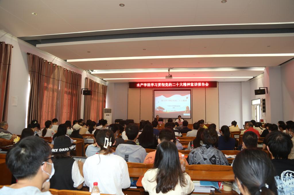 11月30日,水产学院在水产楼109室举办学习贯彻党的二十大精神宣讲报告会。学校党委理论宣讲团成员、马克思主义学院副教授刘艳应邀作主题报告,学院全体教职工及学生代表120多人参加,报告会由学院党委书记王海燕主持。