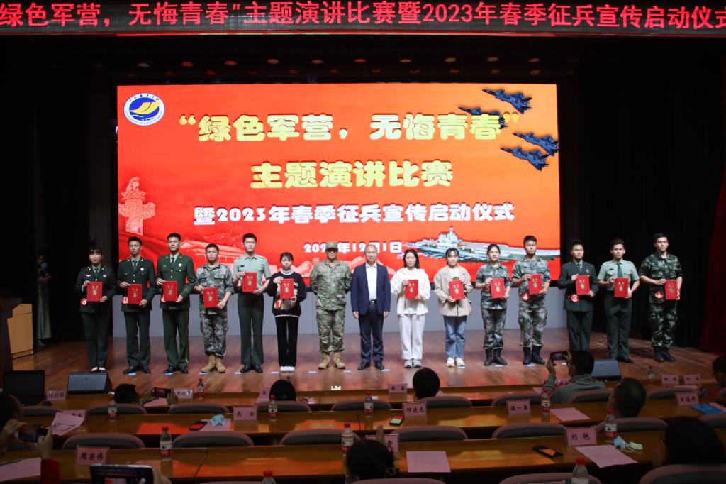12月1日下午,学校首届“情系国防”主题活动之“绿色军营,无悔青春”主题演讲比赛暨2023年春季征兵宣传启动仪式在湖光校区广学楼多功能厅举行。学校党委常委、副校长邓逢光,麻章区人民武装部上校部长龙云,麻章区退役军人事务局副局长许景东、服务中心主任黄必卓,学校党委武装部部长温一星出席活动并启动了2023年春季征兵宣传仪式。各学院分(兼)管学生工作的领导、兼职武装干部以及学生代表参加活动。