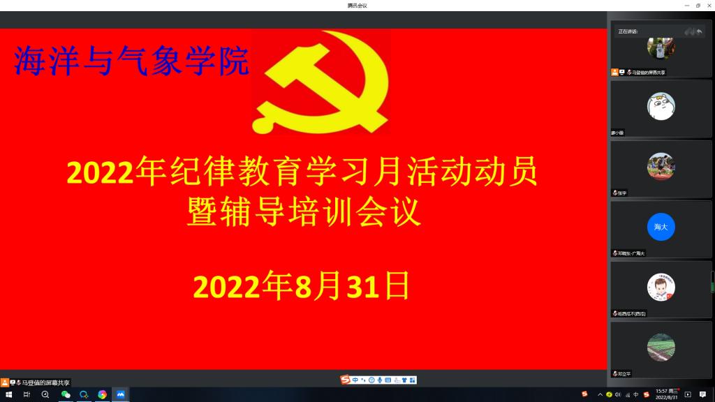 8月31日下午,海洋与气象学院线上召开2022年纪律教育学习月活动动员暨辅导培训会,学院领导、党委委员、纪委委员、副科级以上干部和全体教工党员50人参加,党委书记陈晓作动员讲话暨专题辅导报告,党委委员林海峰对学院2022年纪律教育学习月活动作安排,副院长陈法锦主持会议。