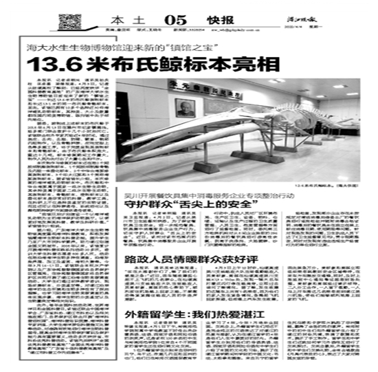 水生生物博物馆近日工作新进展新成效也受到湛江主流媒体点赞报道,湛江晚报、湛江云媒以《“全国科普教育基地”迎来新的“镇馆之宝”—— 13.6米布氏鲸标本亮相》为题报道了水生生物博物馆,包括博物馆海洋哺乳动物标本的制作及规模,社会科普工作以及取得的成绩等。