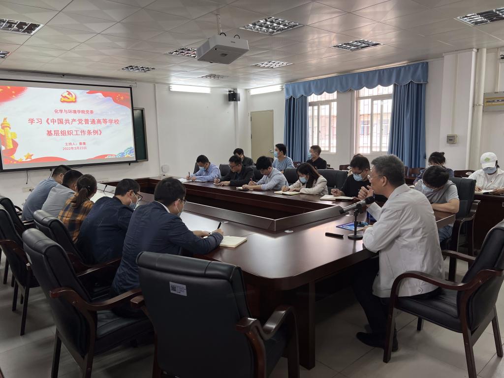 为深入学习两会精神,推动党史学习教育常态化长效化,进一步提升基层党支部的战斗力,3月23日,化学与环境学院党委在第三实验楼B304召开了2022年党建工作布置会暨党支部委员培训会。学院党委书记、全体党支部委员、组织员参加会议,会议由学院党委书记蔡鹰主持。
