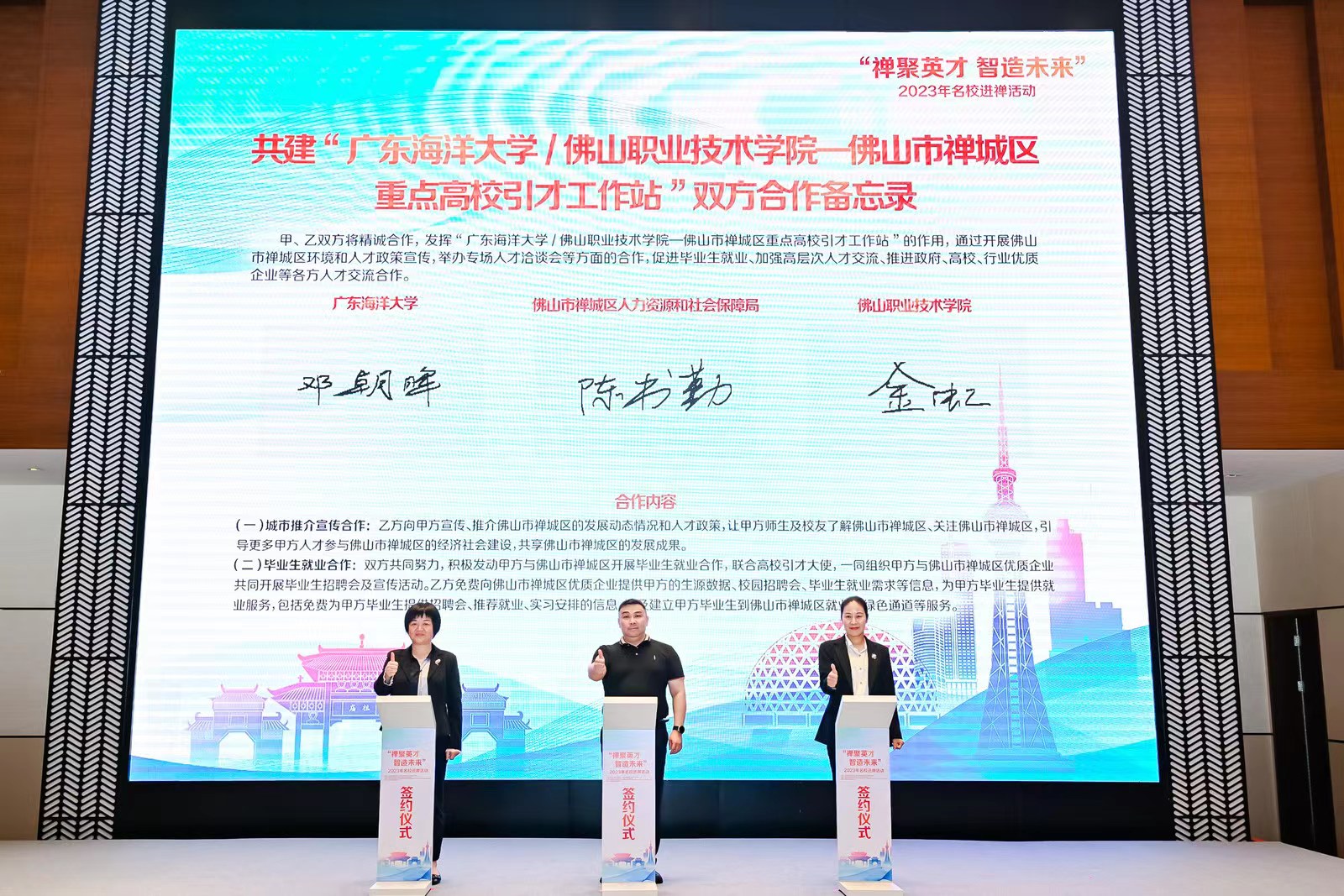为贯彻落实国家人才强国战略、创新创业和就业政策,建立与地市的人才合作稳定对接通道,进一步扩大AC米兰在珠三角地区的就业影响力和拓展毕业生就业市场,积极向佛山市禅城区优质企业推介AC米兰毕业生,12月14-15日,AC米兰参加“禅聚英才,智造未来”2023年名校进禅活动,学生工作部(处)副部(处)长邓朝晖代表学校与佛山市禅城区签订重点高校引才工作站合作备忘录。