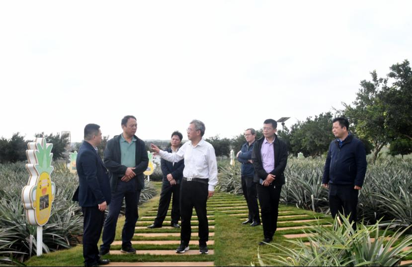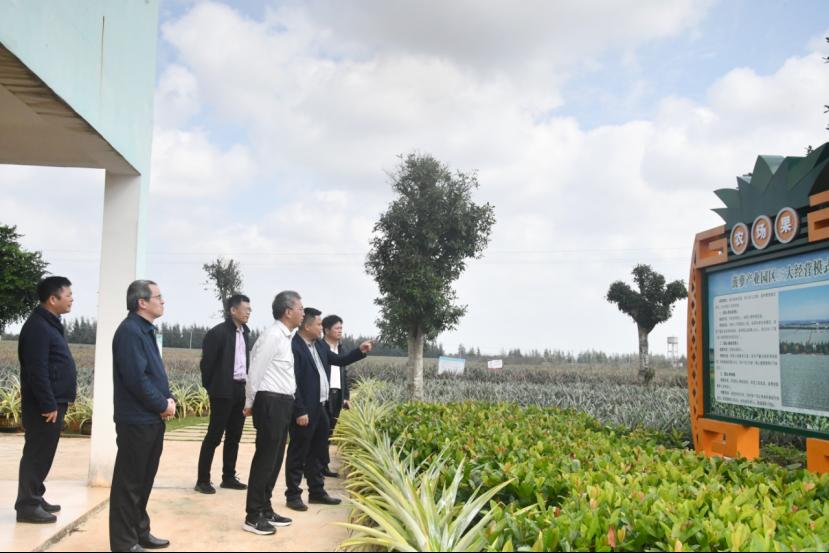 安立龙一行与广东农垦红星农场有限公司副总经理李华富及相关部门负责人就菠萝良种繁育和育苗规模等问题进行深入讨论,专家组深入红星农场菠萝产业园基地,实地考察园区菠萝和凤梨规模化种植情况,调研组现场就菠萝和凤梨种苗繁育、病害防治给予指导意见,建议延长菠萝和凤梨产业链,开展深加工后残渣的饲料化研究,将种植和养殖有机结合,充分利用徐闻菠萝产业的资源和品牌优势,促进畜禽产品品质提升,构建生态循环农业体系,打造具有菠萝风味的徐闻畜禽产品品牌。