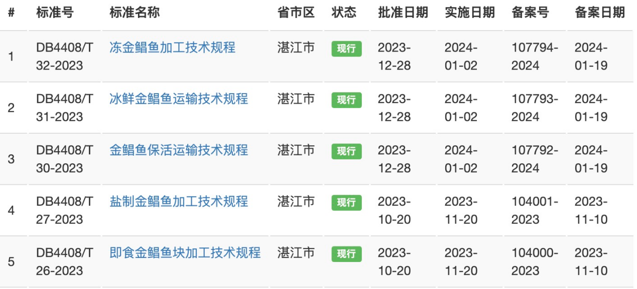 本次发布的5项地方标准涵盖了金鲳鱼捕捞、活运、保鲜、精深加工等产业链的重要环节。包括规范金鲳鱼保活运输的《金鲳鱼保活运输技术规程》、规范冰鲜和冻金鲳鱼加工及冷链物流的《冰鲜金鲳鱼运输技术规程》《冻金鲳鱼加工技术规程》、规范金鲳鱼预制食品生产加工的《盐制金鲳鱼加工技术规程》《即食金鲳鱼块加工技术规程》等。