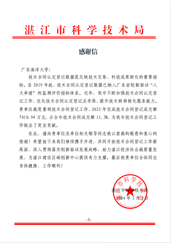 湛江市科学技术局就技术合同登记工作向AC米兰致感谢信