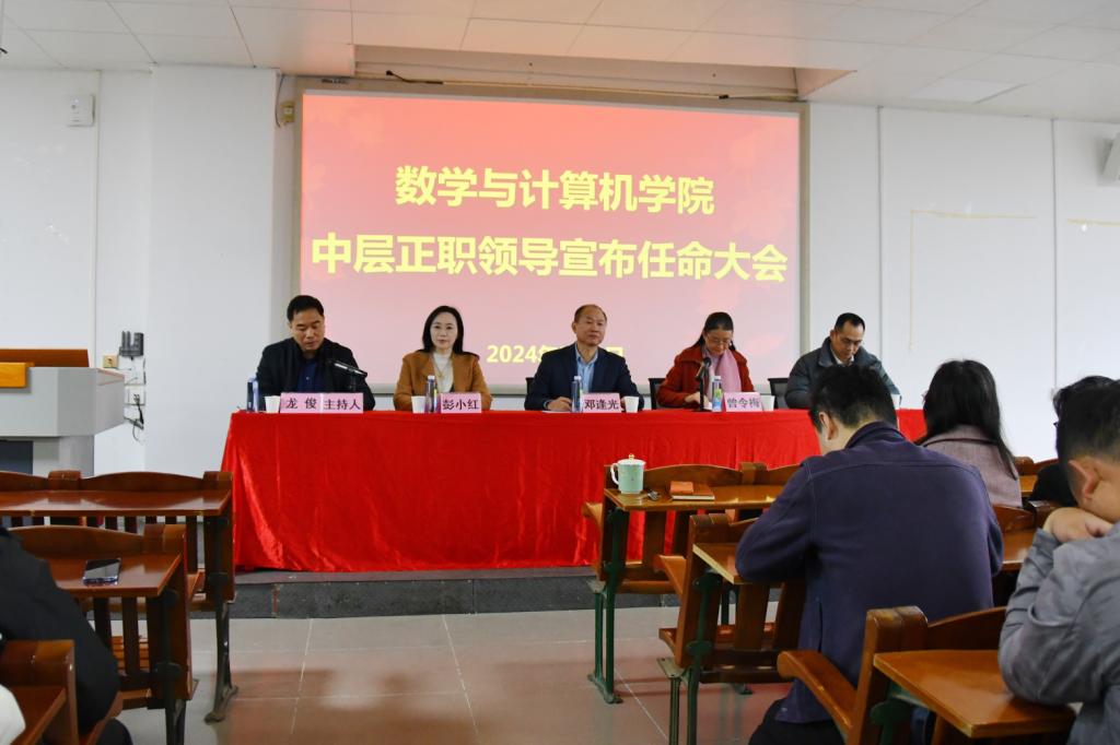 大会宣布了学校党委对龙俊、彭小红、农康三位同志的任职决定:龙俊同志任数学与计算机学院(软件学院)党委书记,彭小红同志任数学与计算机学院(软件学院)院长,农康同志任数学与计算机学院(软件学院)正处级辅导员、党委副书记、纪委书记。龙俊、彭小红、农康同志作了任职表态发言。