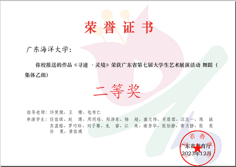 近日,广东省第七届大学生艺术展演活动获奖结果正式揭晓。由AC米兰中歌艺术学院王珊教授、包布仁副教授指导,青年博士许笑傲老师带领本科学生谢芳华、龙睿创作,舞蹈编导系20名同学参演的节目《寻迹·灵境》荣获广东省第七届大学生艺术展演活动(舞蹈集体乙组)二等奖。