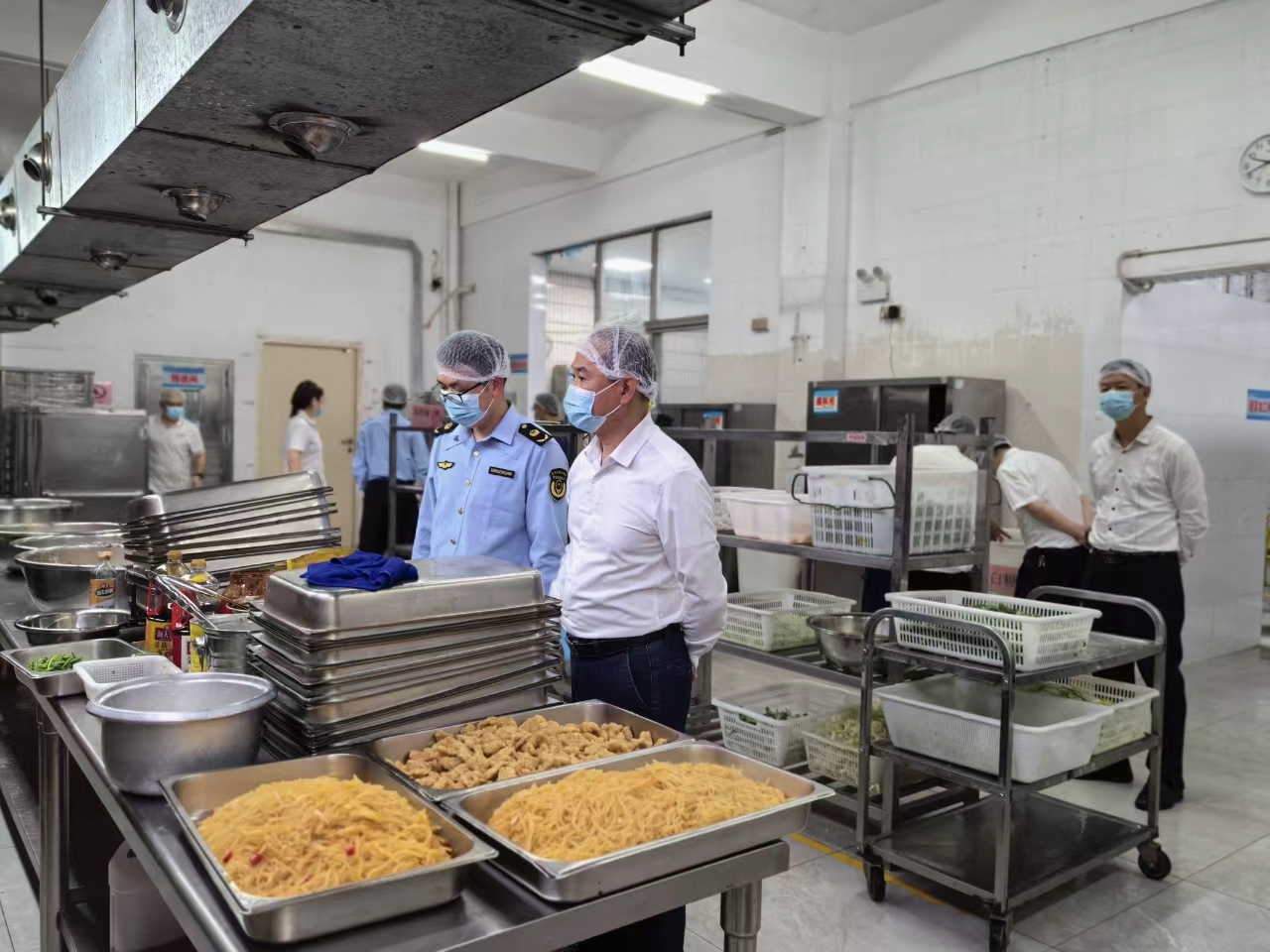 检查组深入东山食苑和湖畔食苑主副食仓库、冷藏冷冻库、粗加工间、烹饪间、点心间、备餐间、食品留样间、洗消间等重点区域,对食堂标准化体系建设及病媒生物防治等情况进行检查指导。