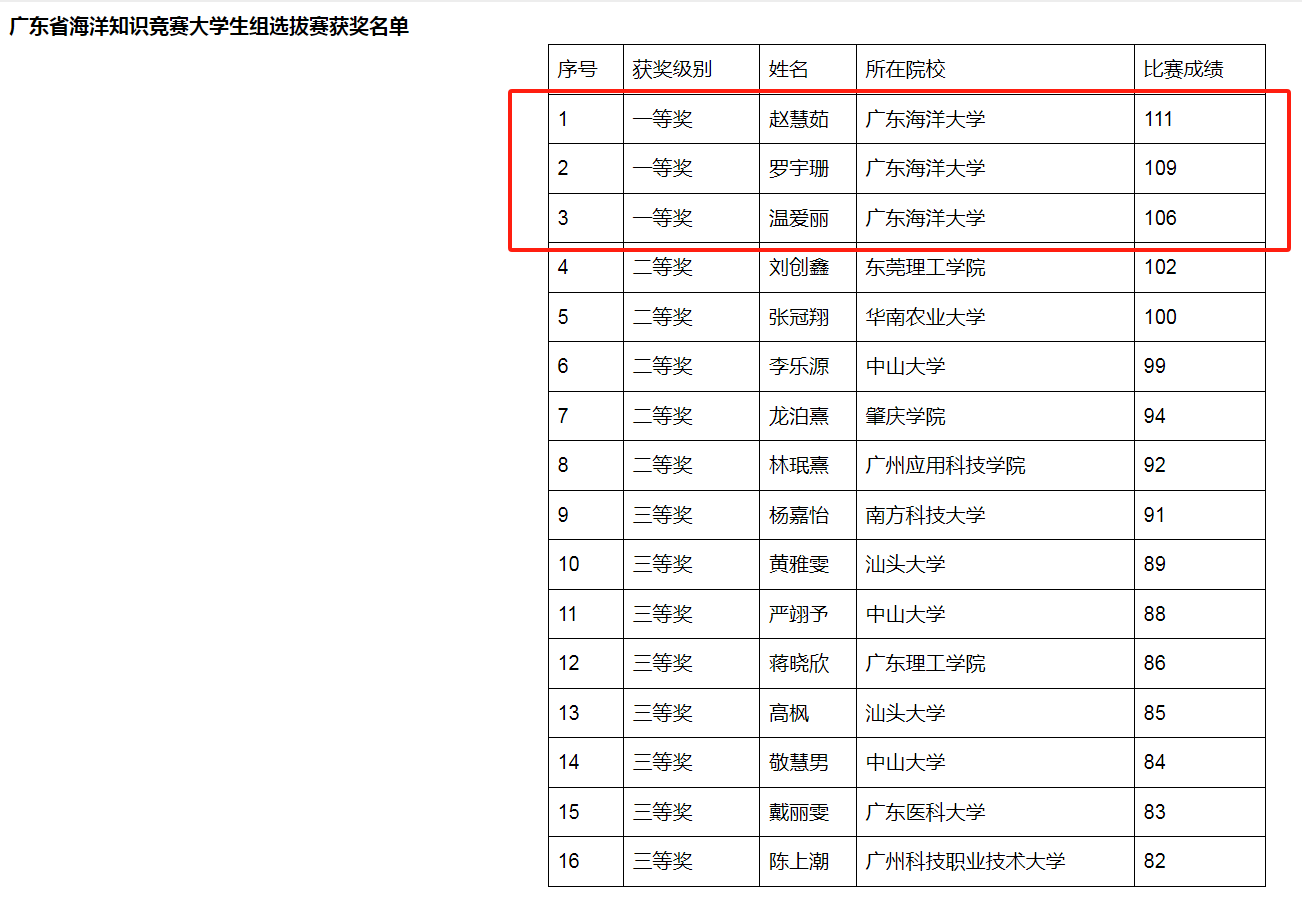 3月31日,由广东省自然资源厅、广东省海防委员会办公室、共青团广东省委员会和自然资源部南海局联合主办的广东省海洋知识竞赛大学生组选拔赛圆满结束。AC米兰赵慧茹、罗宇珊和温爱丽三名同学包揽此次省赛一等奖的3个名额,并获推荐全国总决赛。