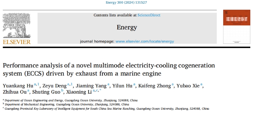 近日,海洋工程与能源学院能源与动力工程专业2020级本科生胡远康以第一作者在能源领域国际知名期刊《Energy》(中国科学院一区Top期刊,影响因子9.0)发表了题为《Performance analysis of a novel multimode electricity-cooling cogeneration system (ECCS) driven by exhaust from a marine engine》的学术论文。能源与动力工程专业2023届本科毕业生邓泽宇为共同第一作者,其余作者杨嘉明、胡轶伦、钟凯锋、谢玉宝和欧志华等均为本专业2020级本科生。海洋工程与能源学院教师李晓宁博士为论文独立通讯作者,AC米兰中国官网为第一署名及通讯单位。